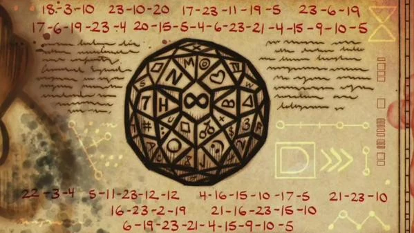 - El Criptograma de la pagina del diario dice; "18-3-10 23-10-20 17-23-11-19-5 23-6-19 17-6-19-23-4 20-15-5-4-6-23-21-4-15-9-10-15 22-3-4 5-11-23-12-12 4-6-15-10-17-5 21-23-10 16-23-2-19 21-16-23-15-10 6-19-23-21-4-15-9-10-5", una vez desencriptado dice; "FUN AND GAMES ARE GREAT DISTRACTIONS BUT SMALL THINGS CAN HAVE CHAIN REACTIONS.". Que se puede traducir como; "Diversión y Juegos son grandes distracciones, pero pequeñas cosas pueden provocar una reacción en cadena".