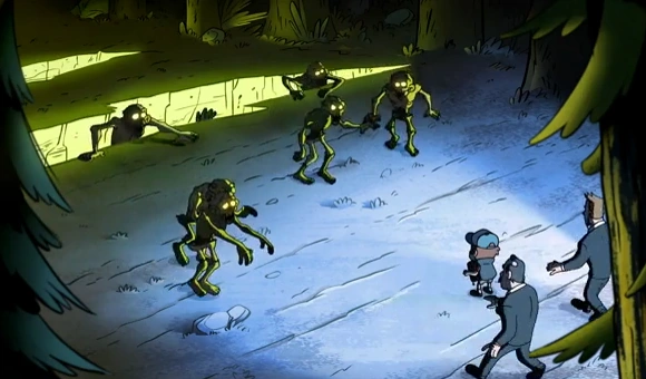 que no había nada sobrenatural en Gravity Falls y lo hecha de su cuarto. Después Stan vuelve a su cuarto secreto y sigue trabajando con el portal. En el bosque, los agentes esperaban a Dipper, que llego con el diario número 3.Les dijo que en ese libro estaban las respuestas a los grandes misterios de Gravity Falls, pero los agentes no le creyeron, entonces Dipper, para hacer que le crean, dice un hechizo mágico para revivir a los muertos. Entonces el suelo se abrió y salieron Zombies. Los agentes se asustaron y dijeron que investigaban casos sobrenaturales, pero que nunca habían lidiado con algo como eso.