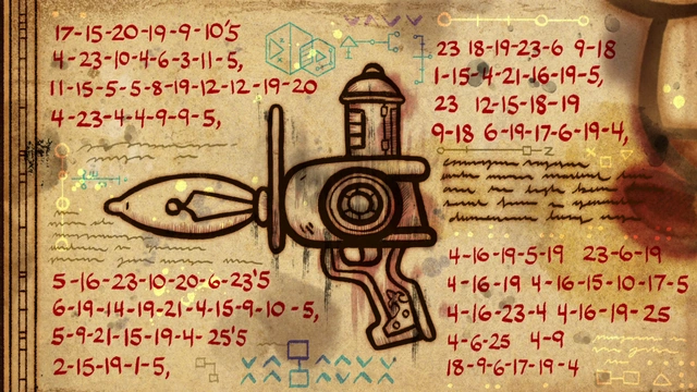 - La sección de pagina revelada al final del episodio dice, "17-15-20-19-9-10'5 4-23-10-4-6-3-11-5, '11-15-5-5-8-19-12-12-19-20, 4-23-4-4-9-9-5," arriba a la izquierda, "23 18-19-23-6 9-18 1-15-4-21-16-19-5, 23 12-15-18-19 9-18 6-19-17-6-19-4," arriba a la derecha, "5-16-23-10-20-6-23'5 6-19-14-19-21-4-15-9-10-5, 5-9-21-15-19-4-25'5 2-15-19-1-5," abajo a la izquierda, y "4-16-19-5-19 23-6-19 18-9-6-17-19-4" abajo a la derecha. Después de usar el cifrado combinado se traduce como "GIDEON'S TANTRUMS, MISSPELLED TATTOOS, SHANDRA'S REJECTIONS, SOCIETY'S VIEWS, A FEAR OF WITCHES, A LIFE OF REGRET, THESE ARE THE THINGS THAT THEY TRY TO FORGET"