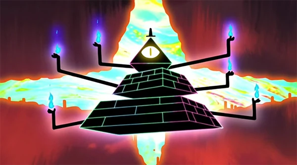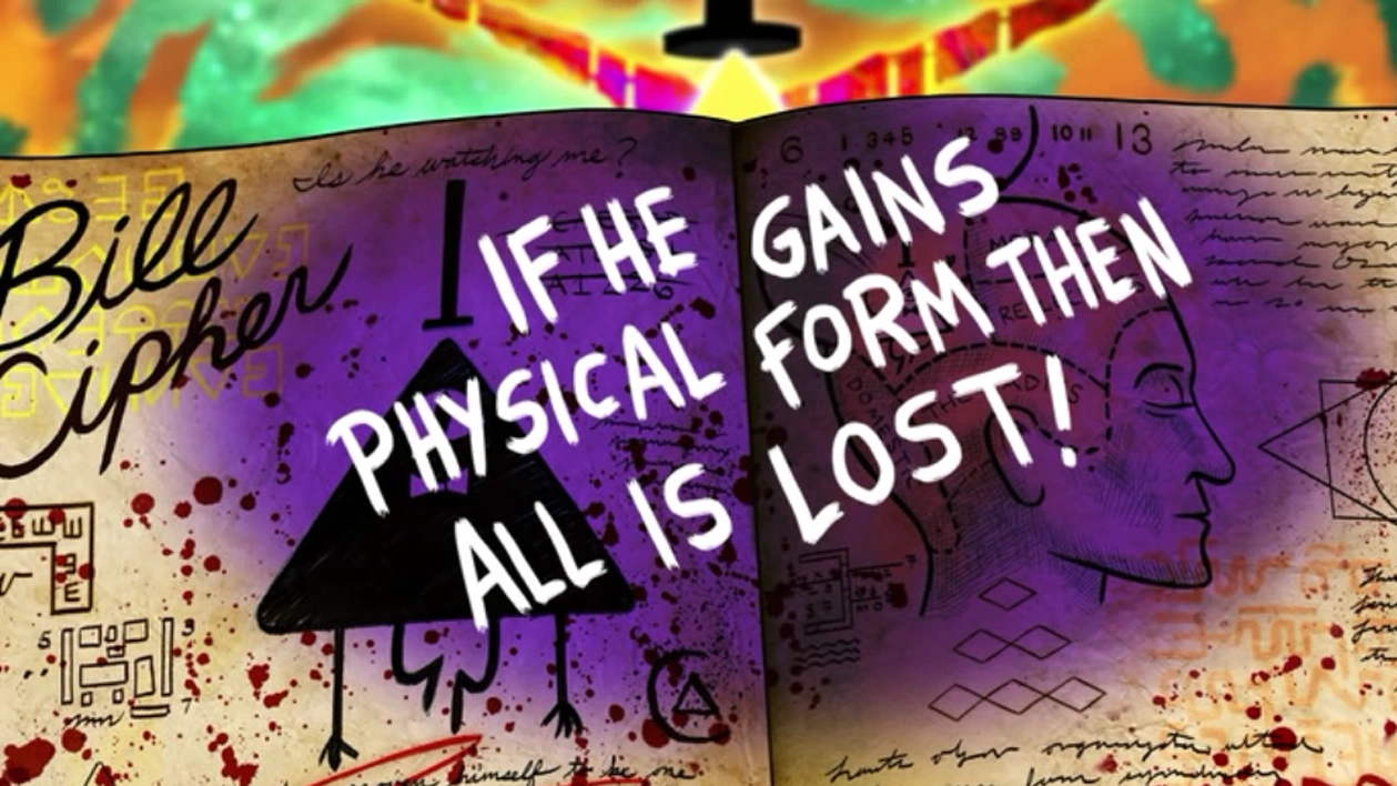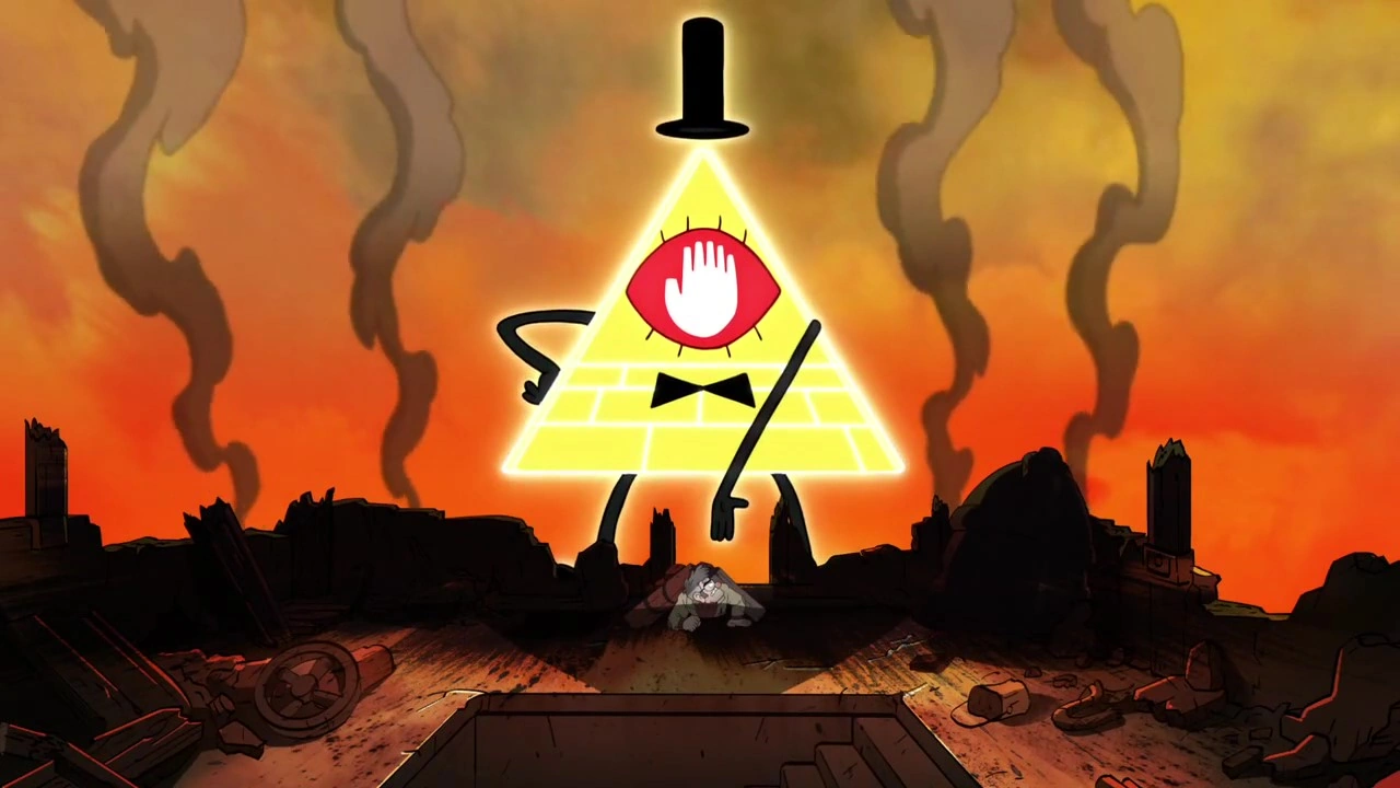 La gente del pueblo de Gravity Falls pone toda la mirada en el cielo con temor a como Bill crece y se transforma en tamaño, convirtiéndose en una abominación piramidal que gira con seis brazos y una forma negra con energía multicolor. Bill vuelve a su forma normal y flota hasta la ciudad, anunciando que va a ser el amo y señor de Gravity Falls para la eternidad. A continuación, funde una estatua de Nathaniel Noroeste, todo mundo queda atónito al poder del triángulo.