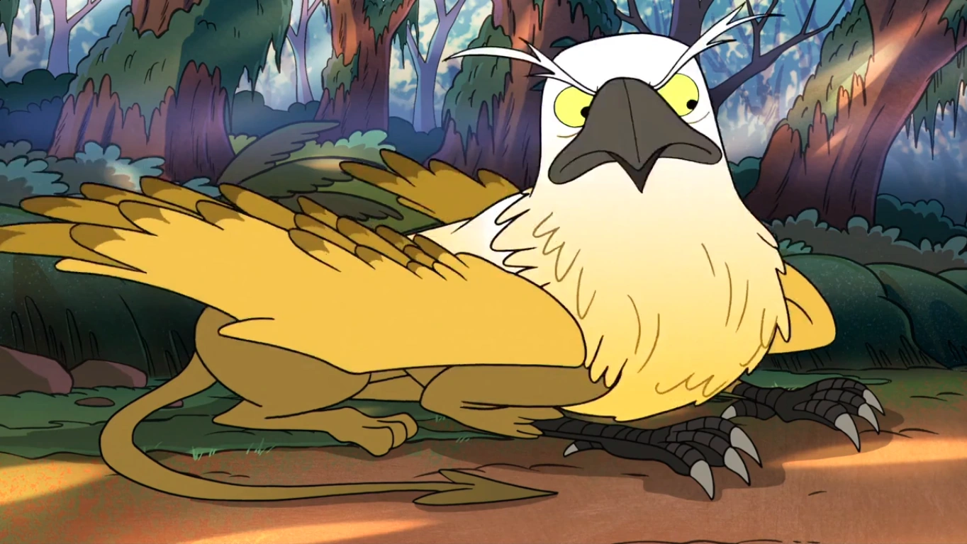 Грифон был показан в эпизоде «Подземелья, подземелья и ещё больше подземелий», где появляется среди команды фантастических существ, выбравшихся из настольной игры «Подземелья, подземелья и ещё больше подземелий». Он уносит своих товарищей с Фордом и Диппером в лес. В титрах Грифон уносит Тоби Решительного. Неизвестно, вернулся ли Грифон в своё измерение так же, как и Вероятник Мерзейший.
