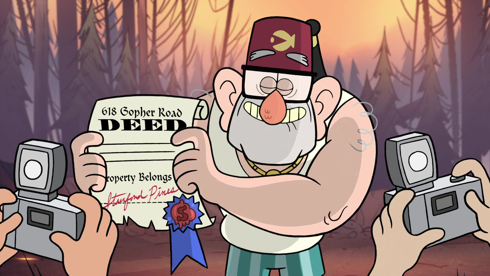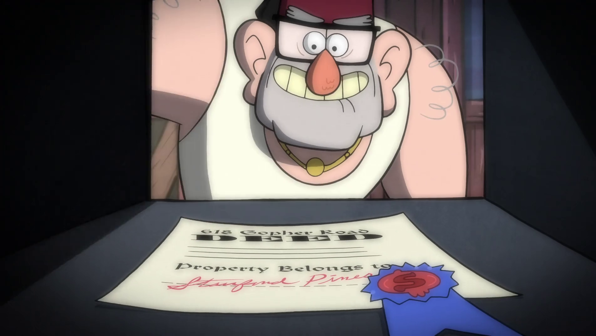 Стэн хранит свидетельство в своём кабинете, в сейфе. Гидеон пытался бесчисленное количество раз украсть его. В частности, в эпизоде «Дважды Диппер» он грозится выпустить из банки проклятых египетских термитов, требуя Стэна отдать документ на собственность.