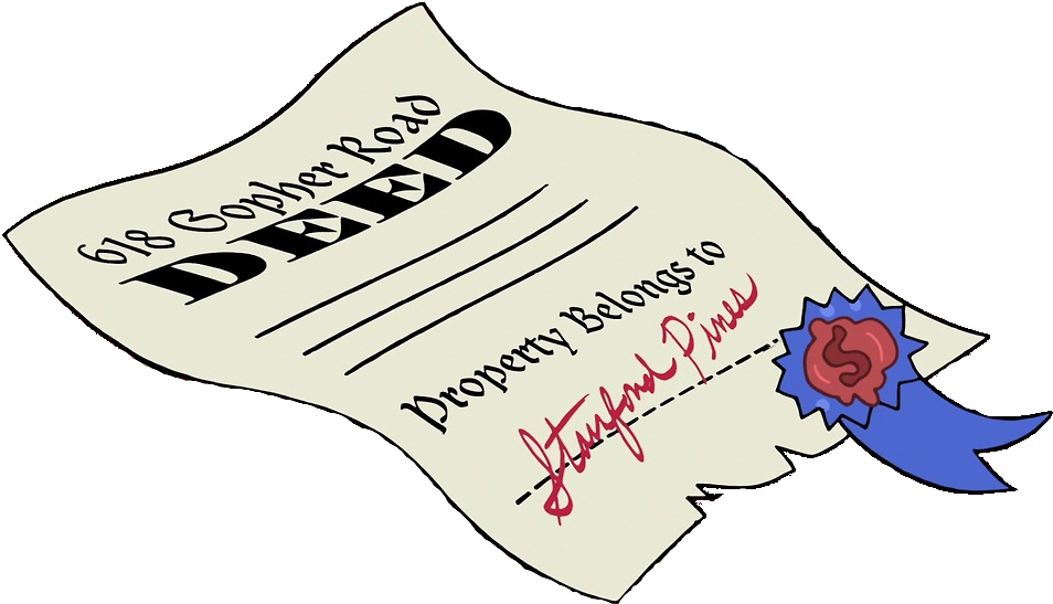 Свидетельство о собственности выглядит, как обычный документ. Над словом «СВИДЕТЕЛЬСТВО» написан адрес: 618 Гофер-Роуд. Под словами «Недвижимость принадлежит» расположена подпись Форда. Он также имеет голубую ленточку с красным штампом в правом нижнем углу, на котором стоит буква «S», которая, предположительно, означает «Стэн». Нижний край документа частично оборван. Возможно, из-за того, что документ подписан Фордом, который попал в портал, Стэну пришлось присвоить его имя на неопределенный срок.