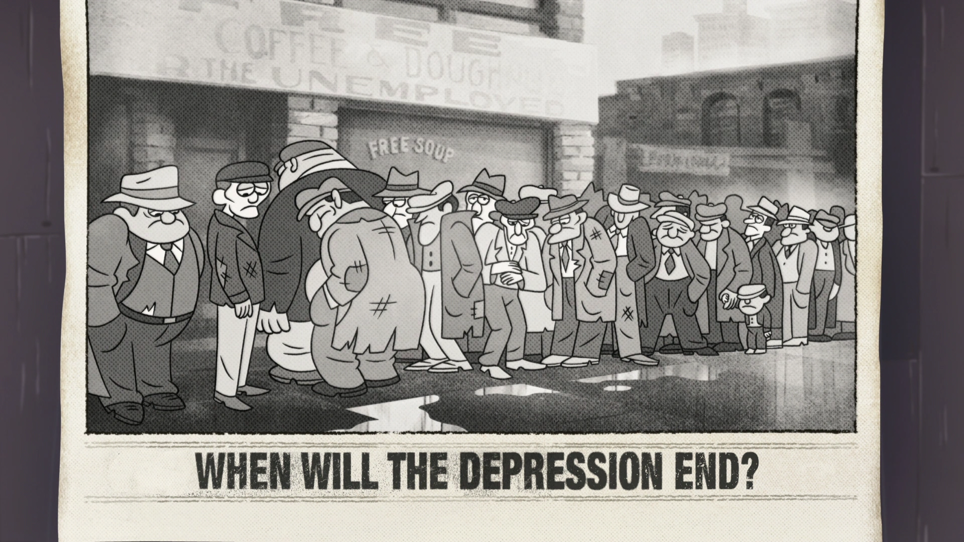 - Чёрно-белая картинка с рабочими иллюстрирует времена Великой депрессии в США в 1929-1933 годах. Немного ранее (3 июля 1928) была показана первая цветная телепередача.