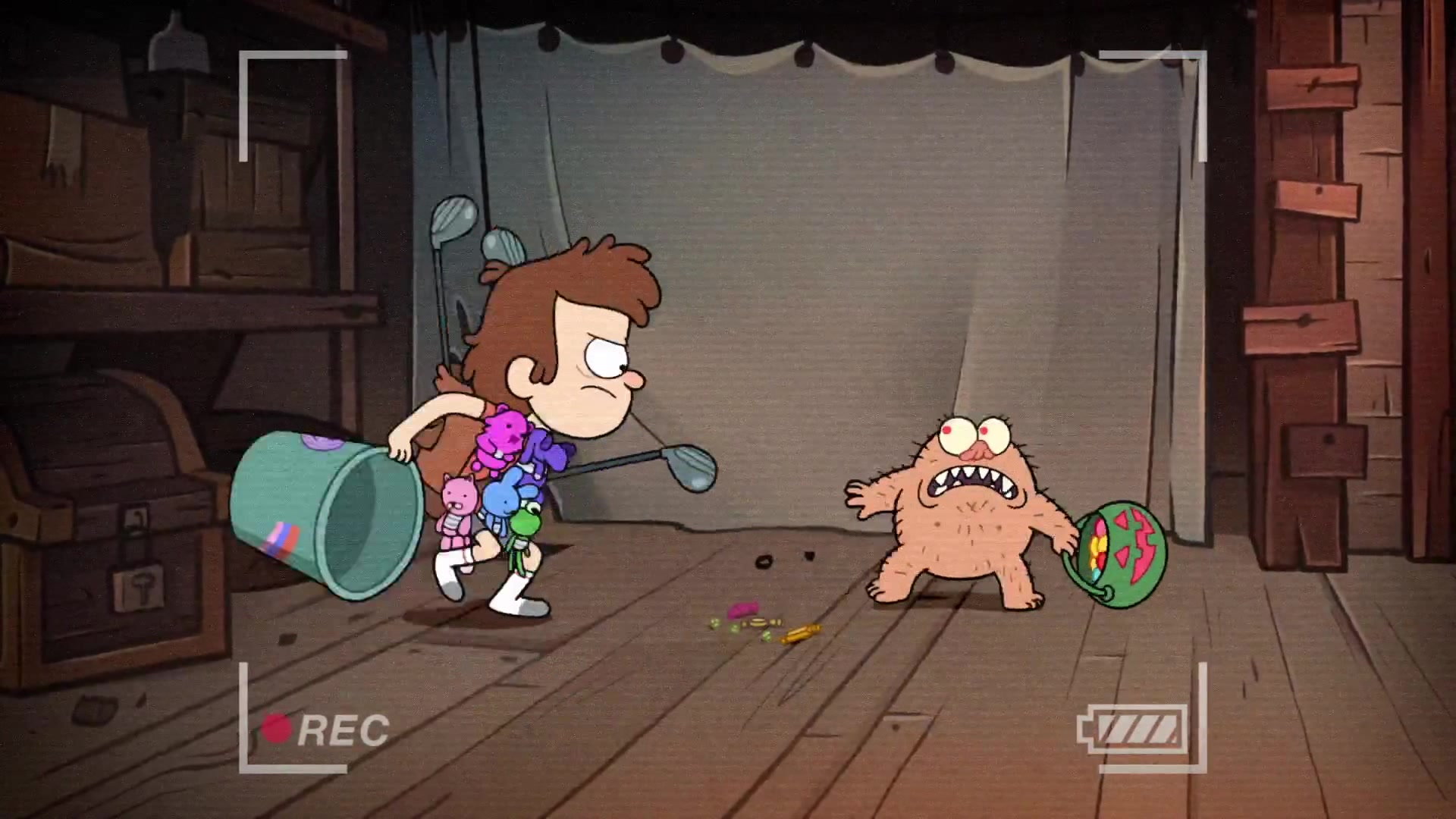 In "Candy Monster," after Dipper concludes a section in his video recording, the creature startles Dipper and starts to cause havoc in the attic. As Dipper wakes up Mabel it starts eating their Summerween candy. Dipper then equips himself with golf clubs and a garbage can as weapons, and armor made out of stuffed animals found in his room. He then advances towards the creature in an attempt to trap it by luring it with candy, but the monster catches on and flees. Dipper and Mabel run after it.