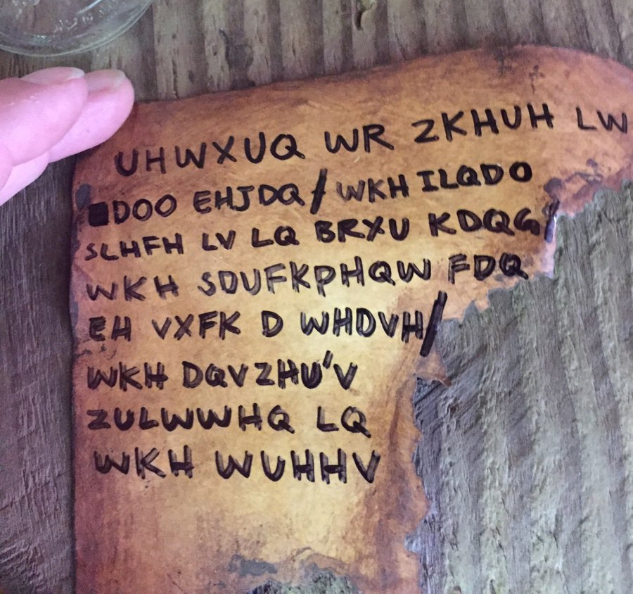 While it was hard to see due to the rain damage, the text once decoded read: