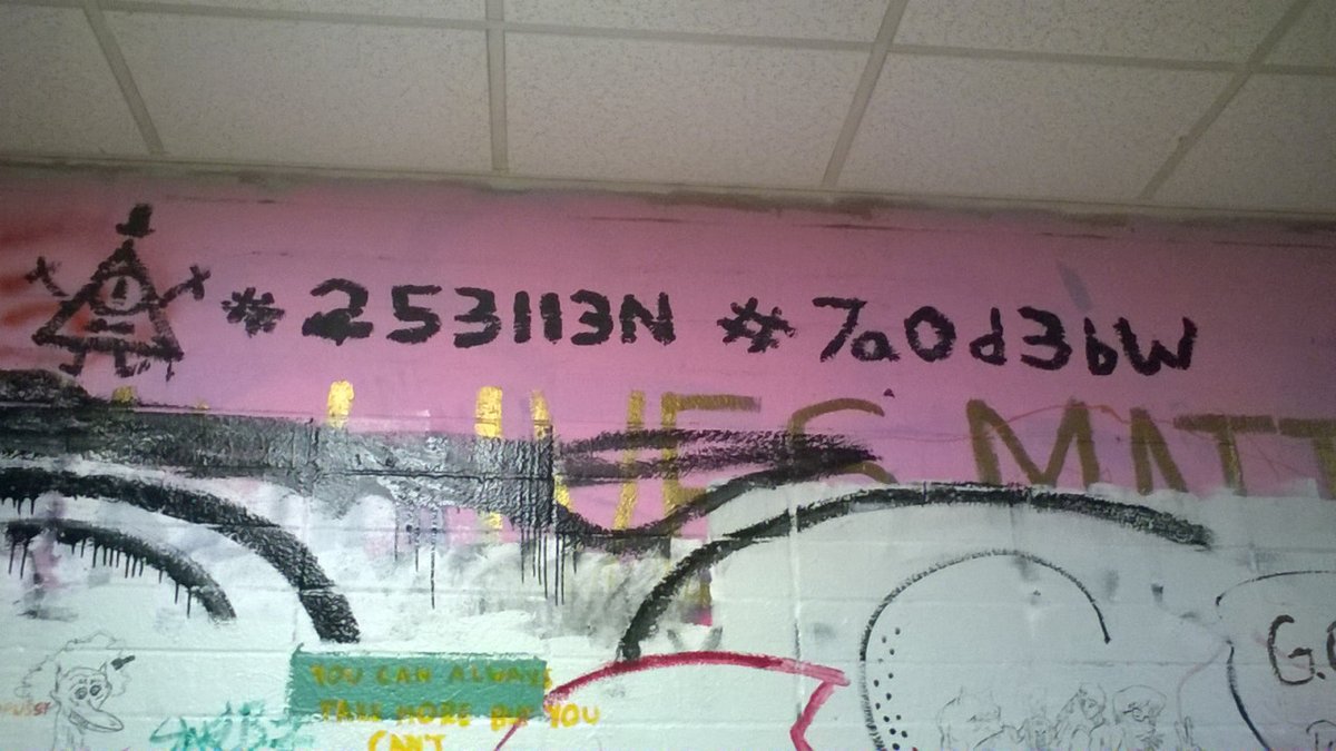 | Sublevel of the California State Summer School for the Arts, Los Angeles, California, USA | @DroveSouR | Graffiti with a drawn Bill Cipher and a series of hex codes that, when decoded, forms a series of coordinates. |