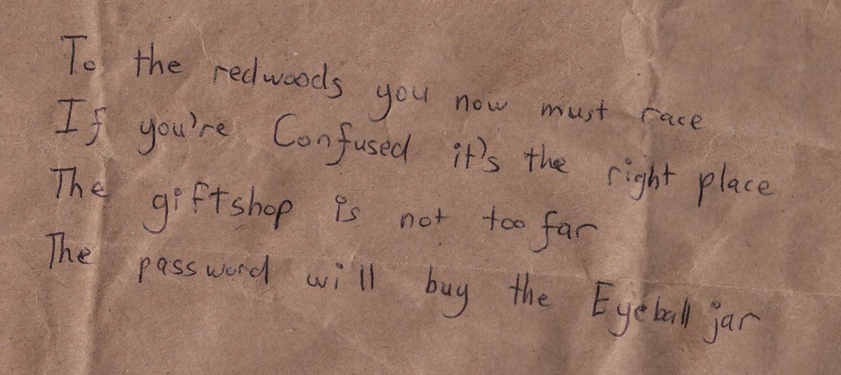 | Confusion Hill, Mendocino County, California, USA | @rylee_stanton | A message under a jar of fake eyeballs only given when the passcode, FILBRICK, is said. |