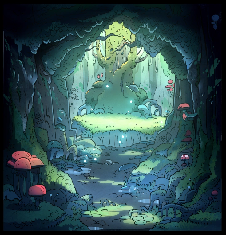 The Gnome forest[1] is a hidden area of the Gravity Falls Forest that is home to the gnomes. There are also fungi, moss, trees, and fireflies residing within this forest.