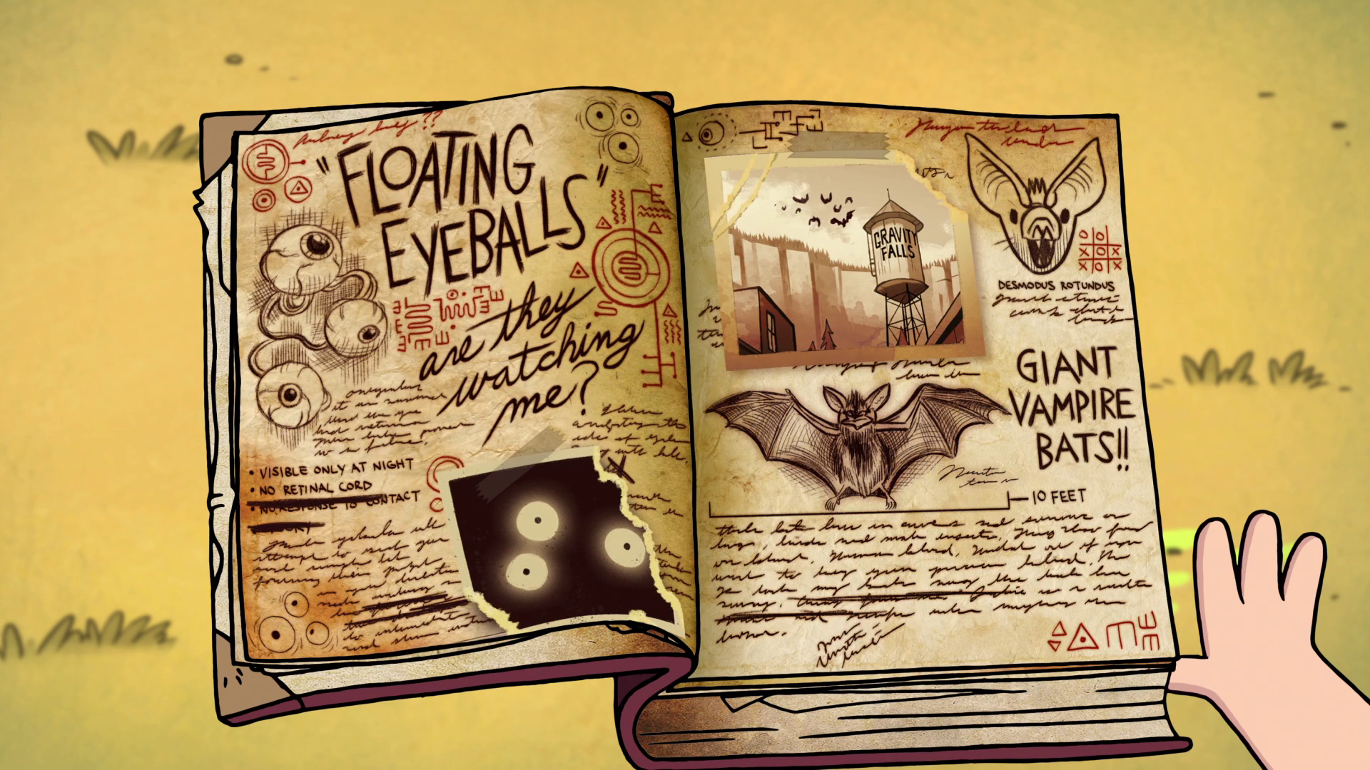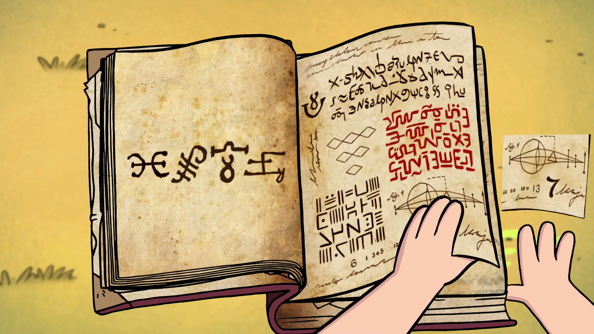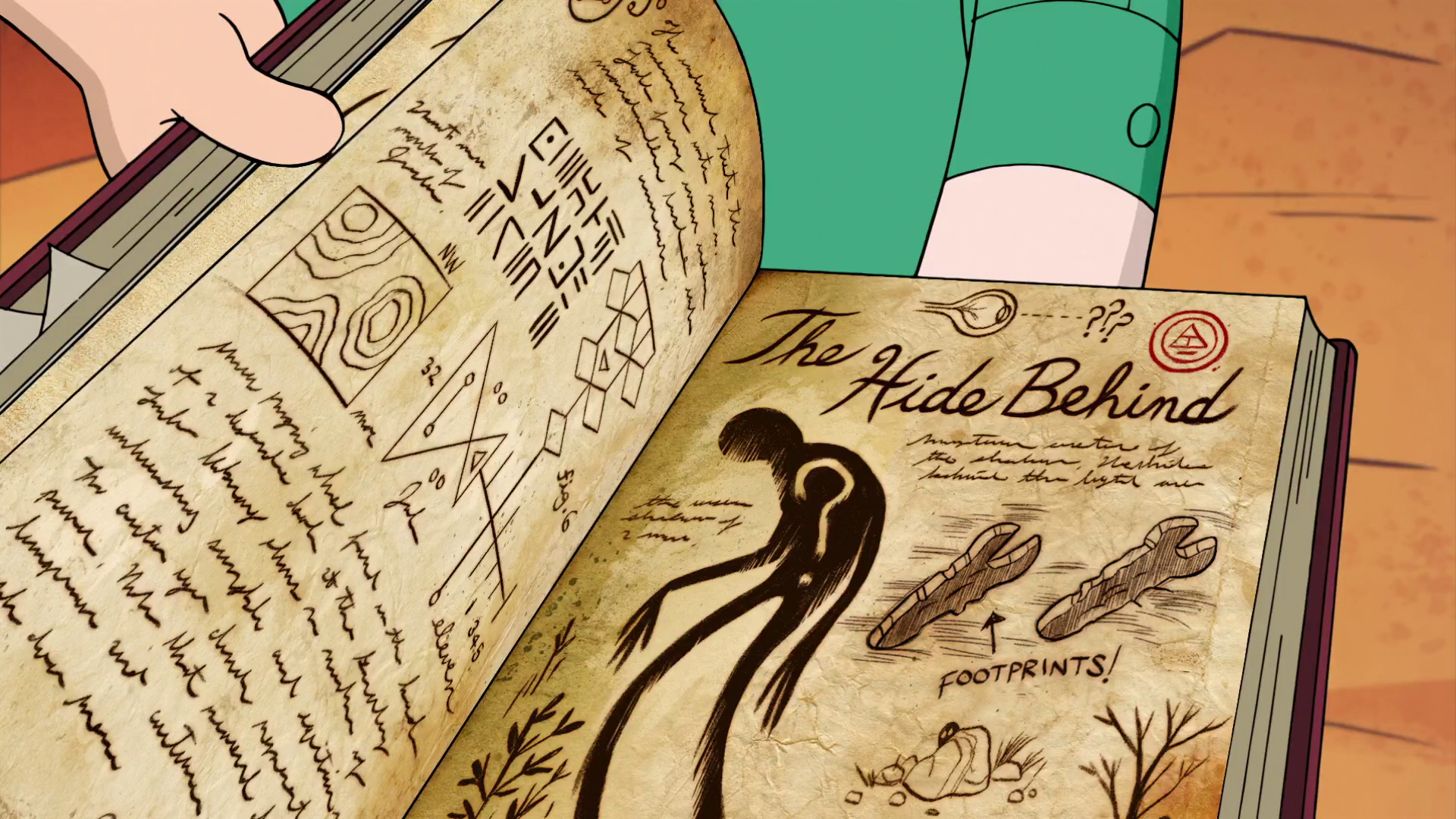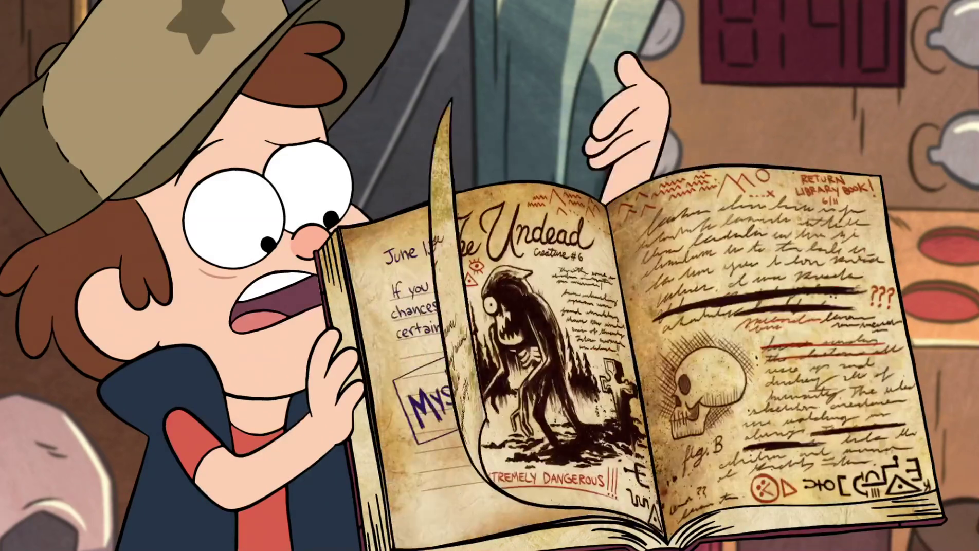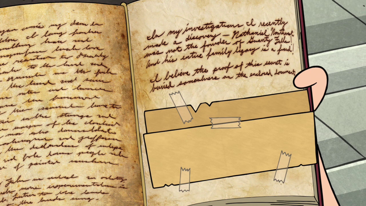 In "Headhunters," Dipper flips through a few pages at the scene of Wax Stan's murder, and is seen reading it at the living room table after Mabel returns from her first date with Gideon Gleeful in "The Hand That Rocks the Mabel." Dipper shows the page on ghosts to Mabel in the gift shop in "The Inconveniencing," and later to Wendy Corduroy and her friends.