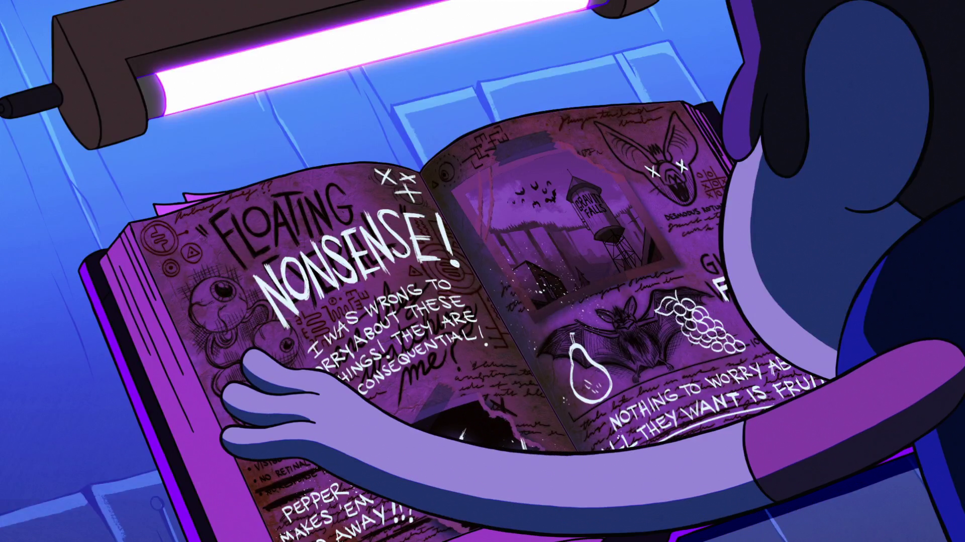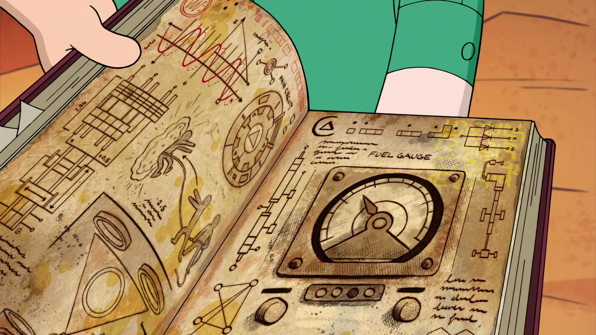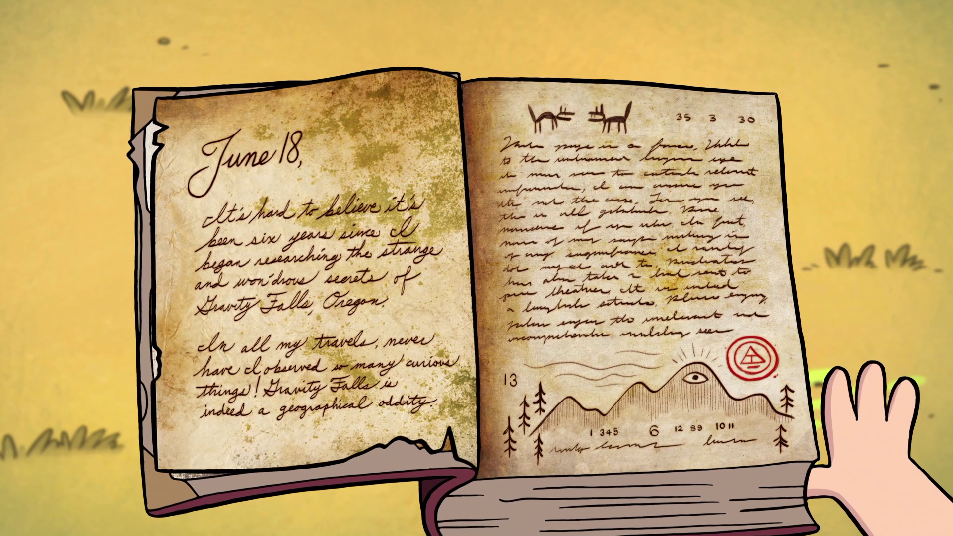 Journal 3 continues to assist Dipper in his encounters with the supernatural, including guiding him into a cave behind a waterfall in "The Legend of the Gobblewonker," during which he, Mabel and Soos flee from Old Man McGucket's Gobblewonker robot.
