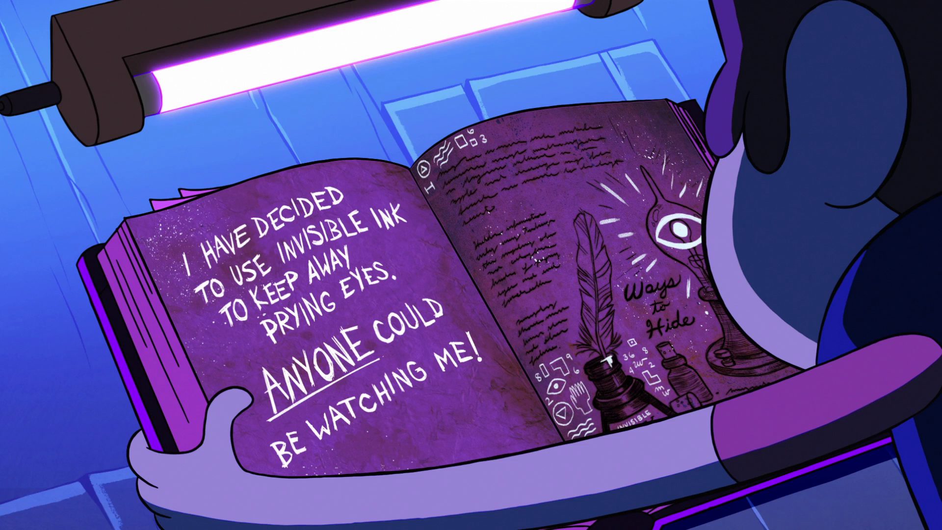 In "Society of the Blind Eye," Dipper (believing Old Man McGucket to be the Author) shows him some of the Journal's pages, leading to their discovery of the Blind Eye Society. In "Little Gift Shop of Horrors," Dipper uses his black light to learn of the Percepshrooms and their intelligence-enhancing properties. In "Northwest Mansion Mystery," Dipper uses it to look up Ghost categories. Learning that the Ghost of Northwest Manor is a category 10, he checks the entry, using the black light to uncover the best way to deal with them. The entry tells him to "pray for mercy."