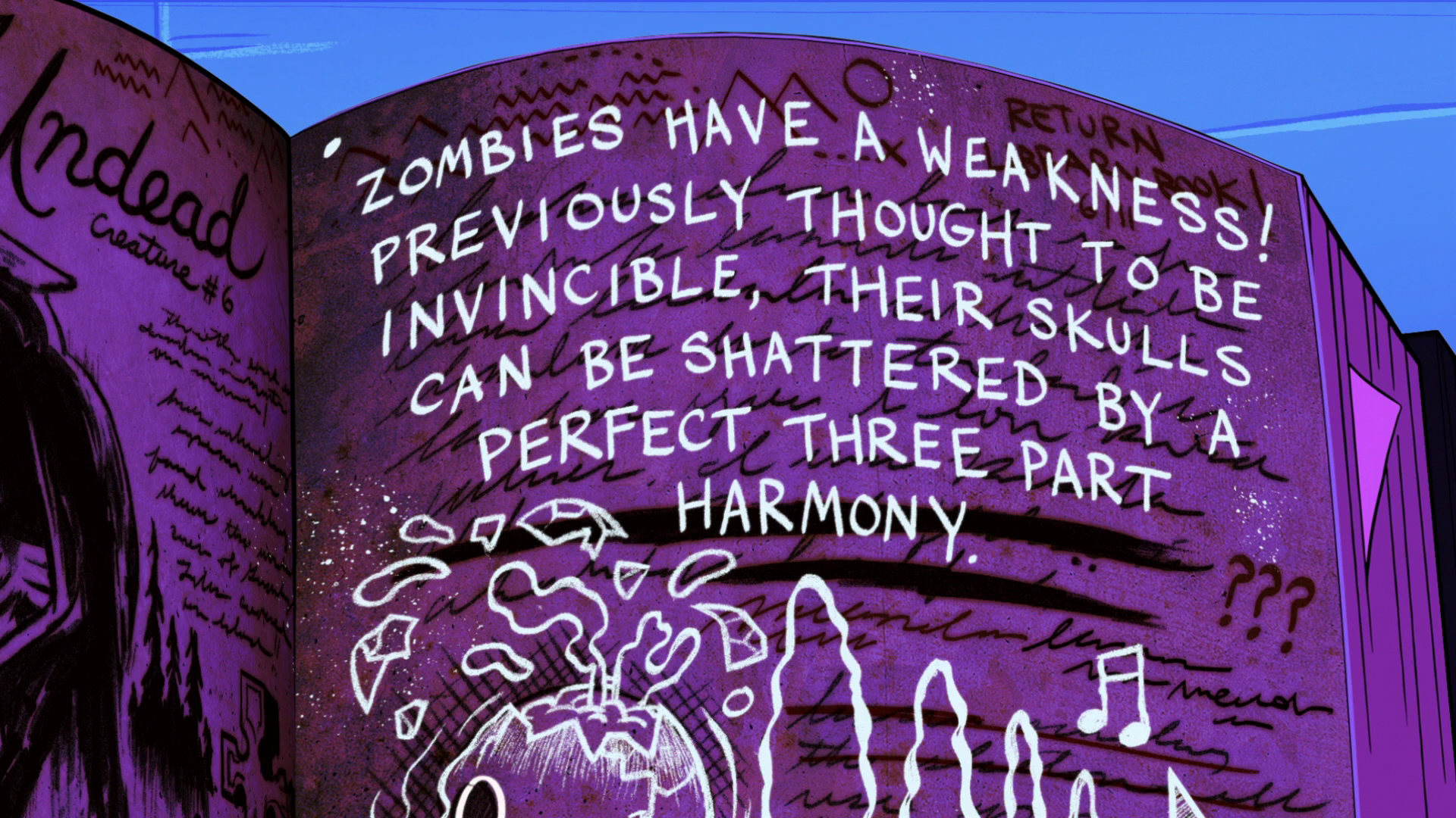 Following the portal's activation, Stan photocopies Journal 3's contents before returning it to his nephew, allowing him to continue to explore its secrets in "Scary-oke." After the arrival of Agent Powers and Agent Trigger, Dipper attempts to reveal the paranormal information of Journal 3, much to Stan's chagrin. Despite their disbelief, a curse from the journal is accidentally invoked, and a horde of zombies is raised that crash the Mystery Shack is Back party. During the attack, the Pines learn that some of the journal has been written in invisible ink revealed by blacklight, allowing them to learn the weakness of zombies.