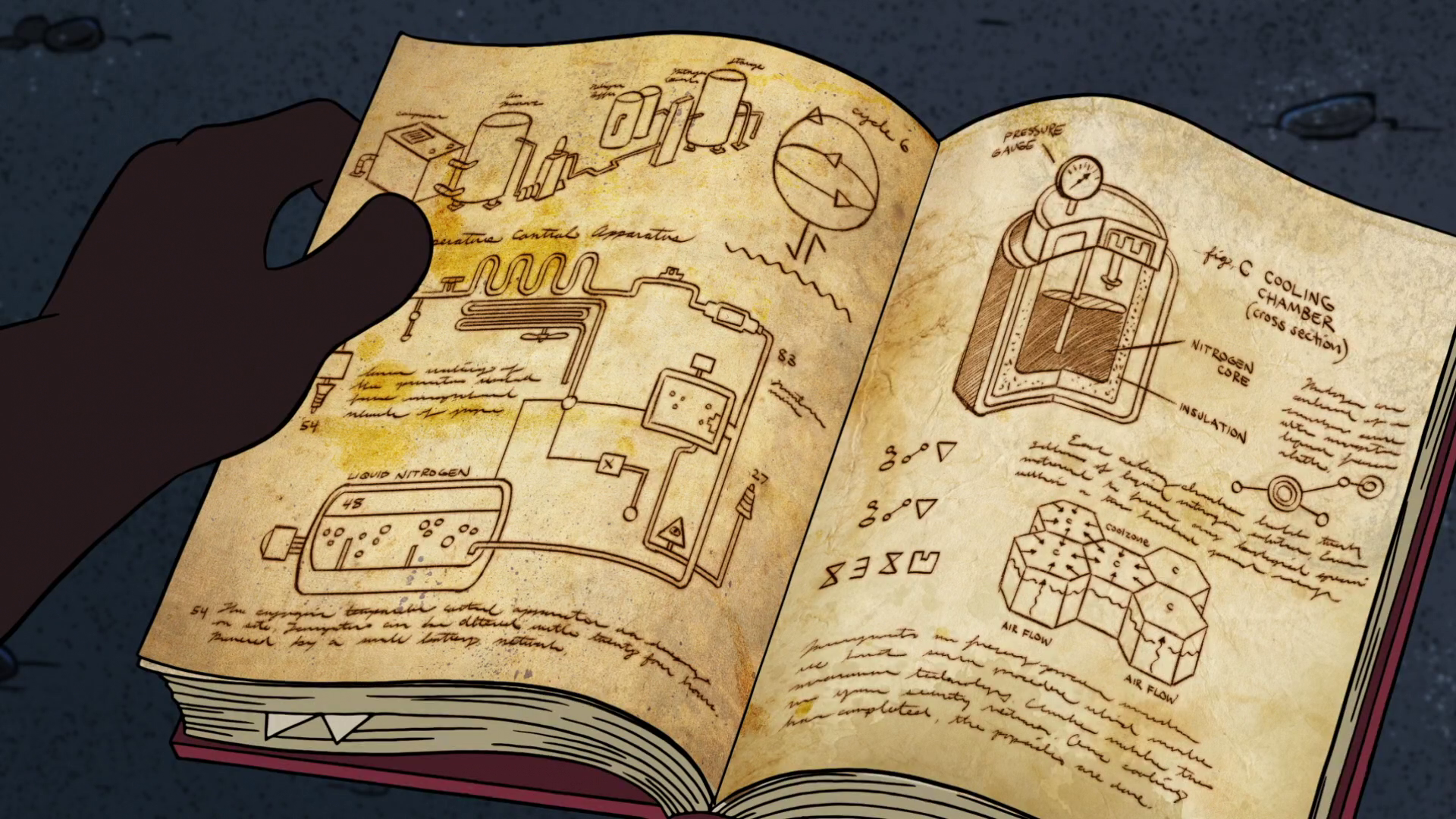 The book has details outlining how the author build the cryogenic freezing chamber he used to contain the Shape Shifter. The left page details how the apparatus pumps the liquid nitrogen. The right page contains a cross section of the chamber itself, labeling the nitrogen core and insulation. There is a cipher on the right page (written in the author's symbol substitution cipher) that decodes to "Ice Ice Baby."