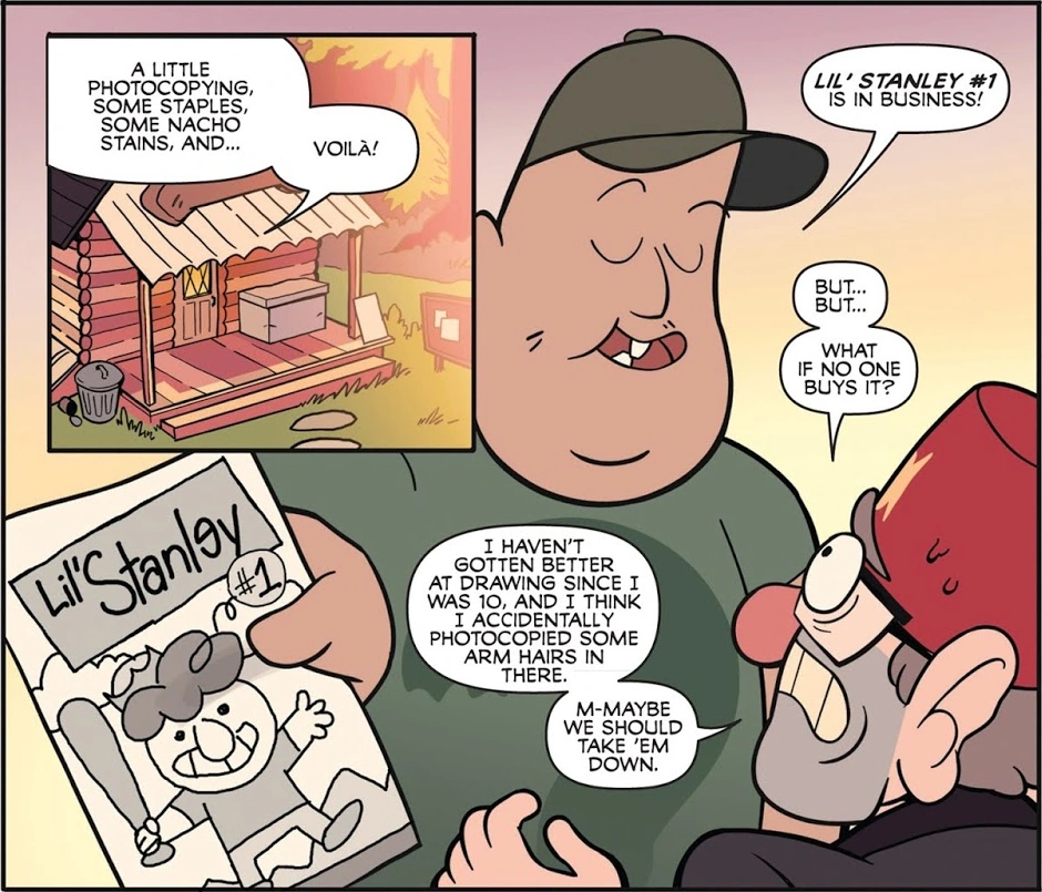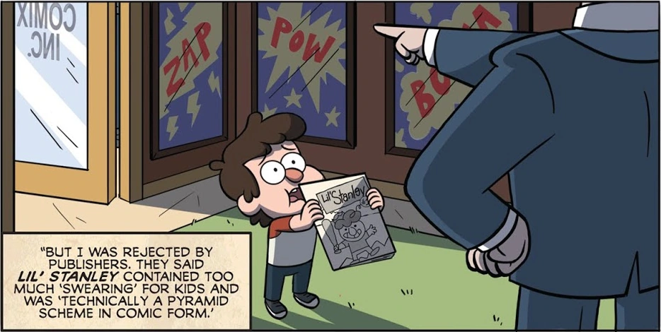 After getting released, Stan recreates the first number of Lil' Stanley with the help of Soos, Stan is worried because of what happened last time he did Lil' Stanley and fears his comic be rejected again, even using excuses that he hasn't gotten better at drawing since he was 10, but Soos assures him, that he'll be fine. Then a kid comes to Mystery Shack and reads one of the Lil' Stanley books and he likes it (calling it "Cool"), for having swears in a book for aimed for children and buys it. Making Stan hug all of the other copies after he leaves and making him cry of happiness after he leaves (although he claims he has ink in his eye).