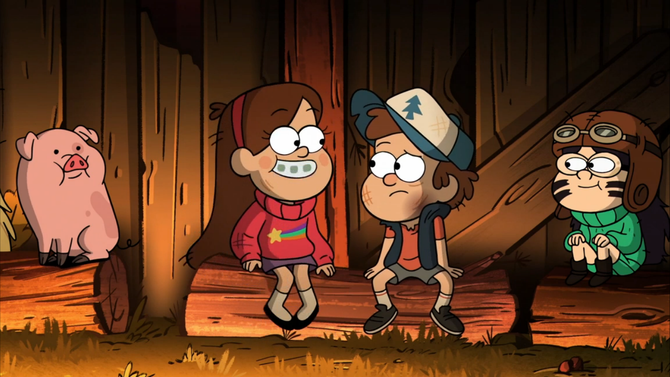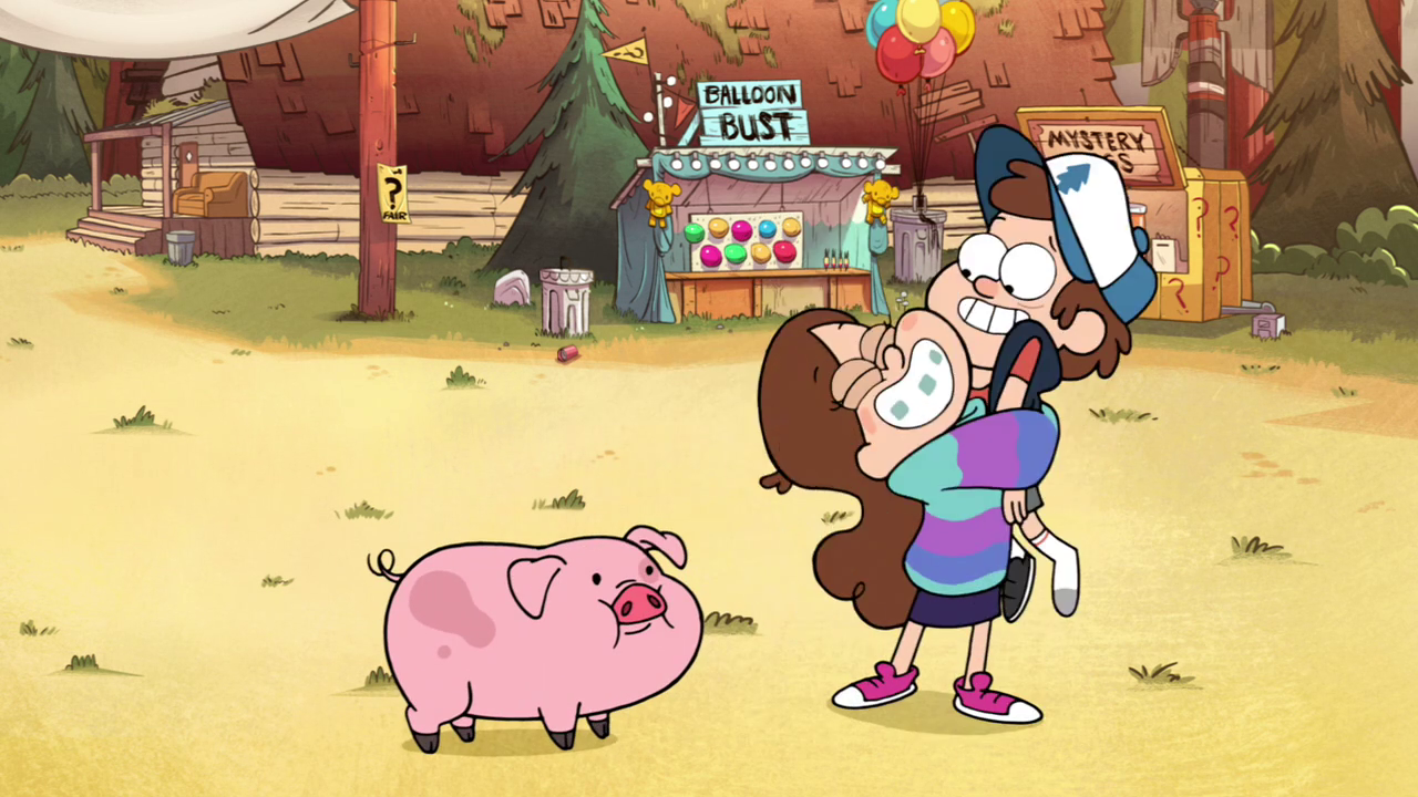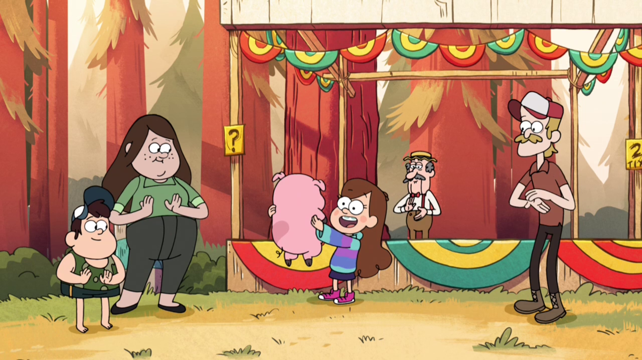 In "The Time Traveler's Pig," when the Mystery Fair comes around, Mabel wins a pig at the fair, who she names Waddles. Later on, she and Dipper find a mysterious man from the future with a time travel device. Mabel wants to go back in time to remember her greatest moment in life, adopting Waddles, which she does again and again once they have the device, while Dipper keeps on going back to stop Robbie from dating Wendy. Eventually, Mabel helps Dipper succeed, but this leads to Mabel not winning Waddles. They get in a huge fight and end up going through time, to the 1800s, the Jurassic period, the future, the Mystery Shack about 20 years ago, as well as to parts of the previous episodes "Tourist Trapped," "The Legend of the Gobblewonker," and "Headhunters." They finally end up in the timeline where Mabel doesn't have Waddles. She gives up and becomes miserable. Dipper cannot stand to see his sister in such a miserable state, so he gives in and reverses the timeline so she can have Waddles.[21]