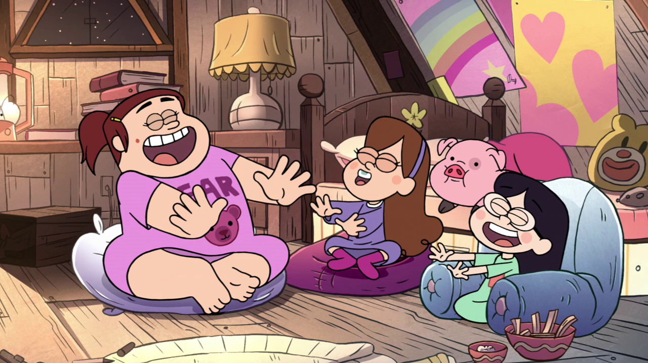 In "Double Dipper," when the Mystery Shack hosts a party, Mabel begs Stan to let her mingle with other kids. He eventually relents and gives her job to Dipper. She then meets Grenda Grendinator and Candy Chiu at the party, who soon become her friends. They tell her about Pacifica Northwest, the most popular girl in Gravity Falls. Pacifica makes fun of Candy and Grenda, so Mabel steps up to compete with her in a competition to see who could "party-hardy," engaging in activities like singing and dancing. Though Mabel initially receives the audience's vote in the form of applause, Pacifica intimidates the party-goers to cheer for her by using an ice-cold glare, and bribes Old Man McGucket. Unlike most of the other guests, who go off to Pacifica's after-party, Candy and Grenda stay at the Shack and have a sleepover with their new friend.[31]