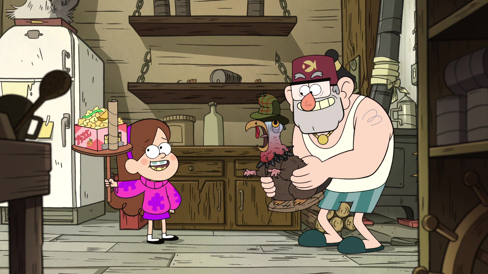 In "Land Before Swine," when Mabel decides to get Waddles a present, she reluctantly leaves the pig with Stan. When she returns, she learns that unfortunately, a Pterodactyl has made off with Waddles after Stan put the pig outside – something she had expressly told him not to do. She then leads the others in getting Waddles back, refusing to even talk to Stan until he saves Waddles from getting eaten, after which she forgives him.