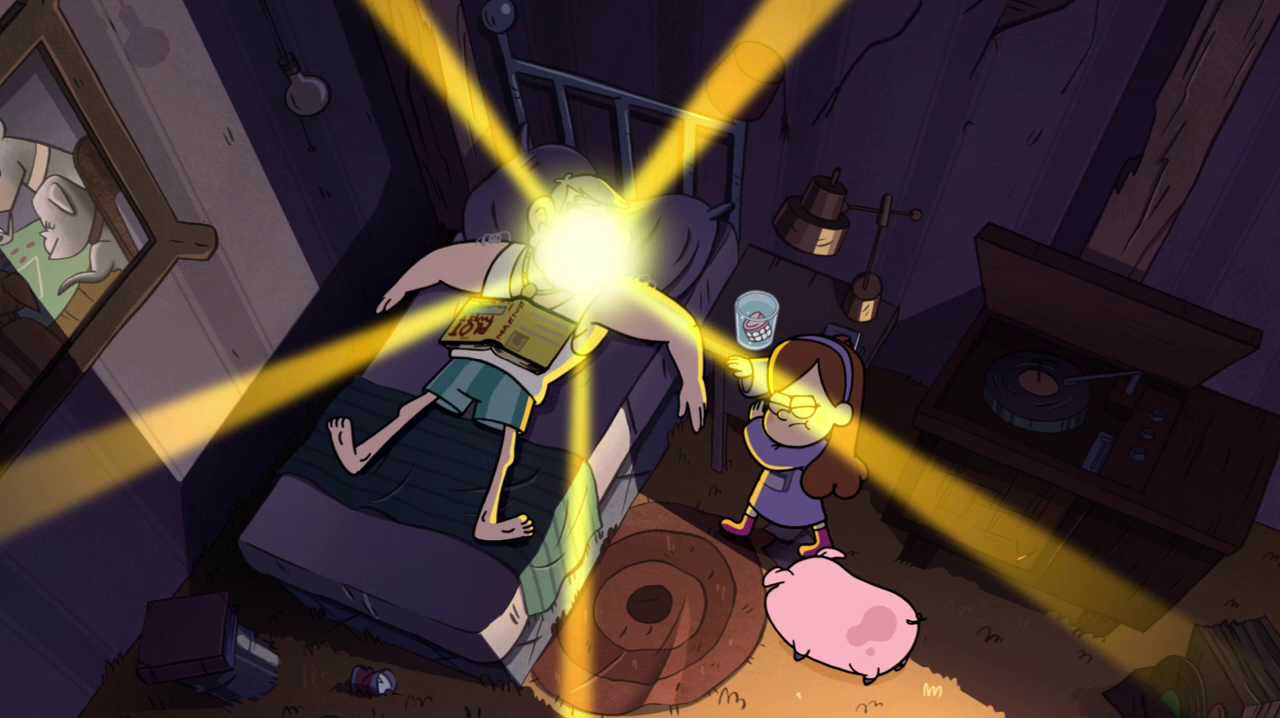 In "Carpet Diem," when the twins grow extremely regretful about sharing a room, they find another within the Shack. Since both want it, they decide to compete for the key to it, but unexpectedly swap bodies in the process and panic as a result. Mabel, being stuck in Dipper's body, began a campaign to make Dipper look bad in front of Stan so that Mabel can get the key to the new room from him. Most of this campaign consisted of breaking stuff and proclaiming she was Dipper. Mabel missed out on a sleepover scheduled that very night with Candy and Grenda to Dipper with her body. Mabel spies on the sleepover through a keyhole after being denied entry. Grunkle Stan, discovering this but believing that Mabel is Dipper, decides that Dipper is "at that creepy age where you spy on girls" and decides to tell him (her) about the birds and the bees. After being traumatized by this, Mabel loses the room to Dipper due to giving the impression that Dipper had decided to stand up to Stan. She continues to hide the key to the room from Dipper, however, and locks herself in the room. However, she is tricked into opening the door by Dipper. After this, she swaps bodies multiple times with multiple people, including Waddles, due mostly to conflict over the key to the room. After everybody is back in their own body and they talk it over, Mabel agrees to let Dipper have the room. The two eventually bond over attic mini-golf after they decide they miss being in the same room and share a room in the attic again.