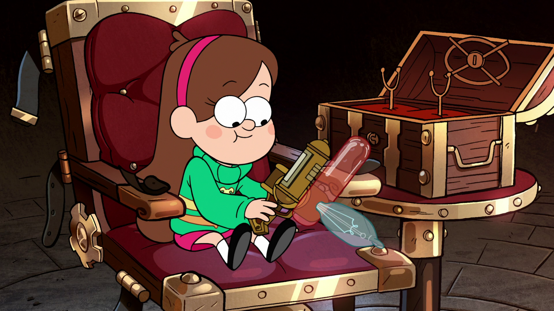 In "Not What He Seems," Mabel and Dipper have their fun day with Stan interrupted when the government arrests Stan for stealing toxic waste. While being taken to child services, the twins hatch a scheme to prove their great uncle's innocence: going back to the Mystery Shack and finding surveillance tapes. Mabel uses her trusty grappling hook to sneak in. When they enter Stan's office, Mabel mentions checking the "antel-rabbit," and it is there that the surveillance tapes are found. The video shows him entering the Shack with a barrel full of waste. Mabel soon stumbles upon Stan's box of fake IDs from all over the country and news clippings that say Stan isn't Stan. The twins find the code to Stan's secret laboratory behind the vending machine, and after a quick scuffle with Soos, they finally enter. Mabel still has reason to believe Stan until Dipper finds the Journals. The three try to shut down the portal until Stan bursts into the lab, begging them not to. After yet another anomaly, Mabel is faced with an extremely difficult choice; to shut down the portal and potentially stopping a world-ending catastrophe, or to believe Stan and leave the portal alone. Mabel's trust in Stan convinces her not to shut it down, leaving Dipper outraged. After the explosion, the Author walks through the portal, with Stan revealing him to be his brother. Mabel asks if this is the part when someone faints; Soos replies that he will, and then faints.
