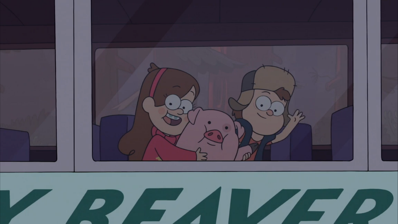 On the day of the twins' departure, Mabel says goodbye to Candy and Grenda, while Stan wears the sweater she knitted for him that day. As the bus arrives, Mabel is forced to say goodbye to Waddles since her parents won't let her bring a pig home with her. However, Waddles doesn't want to leave Mabel much to Mabel's anguish. Not being able to stand seeing Mabel so upset, Stan says that if he had to put up with Waddles all summer, their parents could put up with him until the next summer. When the bus driver tries to protest Waddles coming on the bus, Stan and Ford flash their weapons at him, convincing him to let Waddles on. Stan tries to hide his emotions claiming he's glad to be rid of the kids, but they immediately see through it and Mabel says "We'll miss you too Grunkle Stan." They board the bus and wave goodbye to their friends and family as the bus drives away.