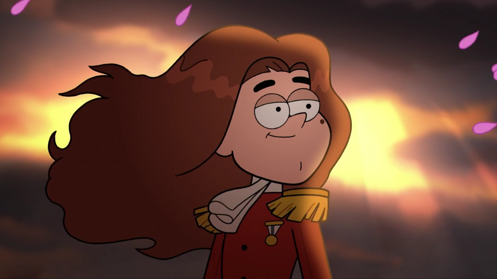 Marius is roughly the same height as Grenda. He has fair skin, thick eyebrows, a large, pointed chin with a cleft, and waist-length curly brown hair. Much like Grenda, he has a red mole on his left cheek. Marius wears a white shirt with a long cravat under a red military tunic with gold epaulets, white pants and gloves, and black riding boots. He also wears a military medal with a white and blue ribbon on his chest.