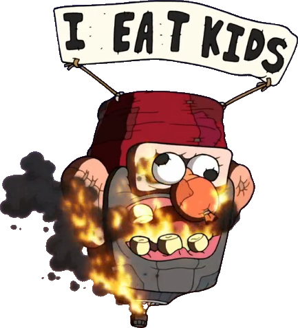 The balloon was modeled after the head of Stan Pines; due to inexpert craftsmanship, however, it ended up looking not nearly as cheerful and inviting as Stan had initially intended it to be. It originally bore the message "I HEART KIDS;" however, after the H and R fell off, it stated "I EAT KIDS," terrifying the youth. It became dangerous and even more terrifying after it caught fire before plunging to the ground.