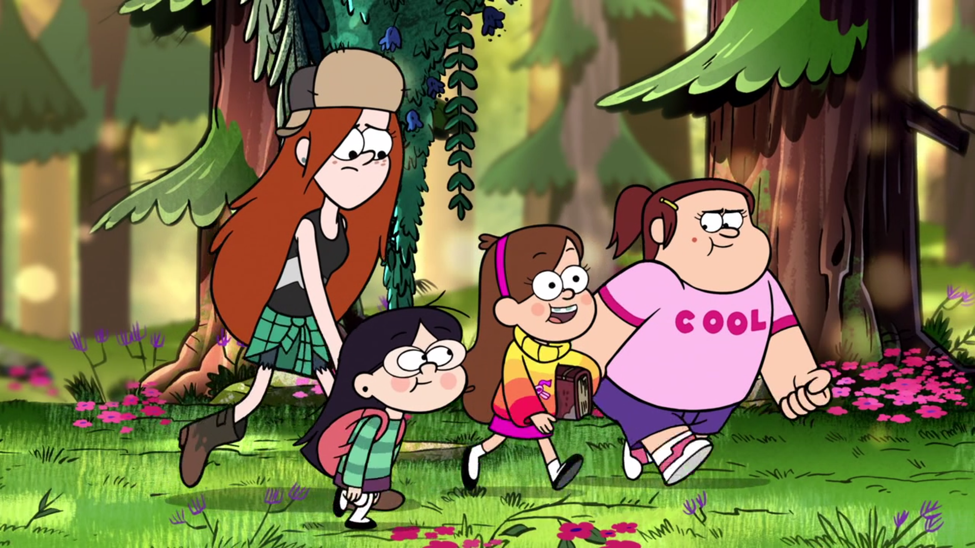 Meanwhile, the girls continue their quest. Mabel, Candy, and Grenda are all excited to see a unicorn. Wendy claims she doesn't believe in unicorns, and only agreed to come along to keep the kids from getting into any trouble. When the girls step into a magical area in the forest, Mabel consults Journal 1 and finds that to summon a unicorn, one must utter a deepest chant once used by ancient druids. After Grenda successfully does so, the glade rises up out of the ground, and the girls enter.