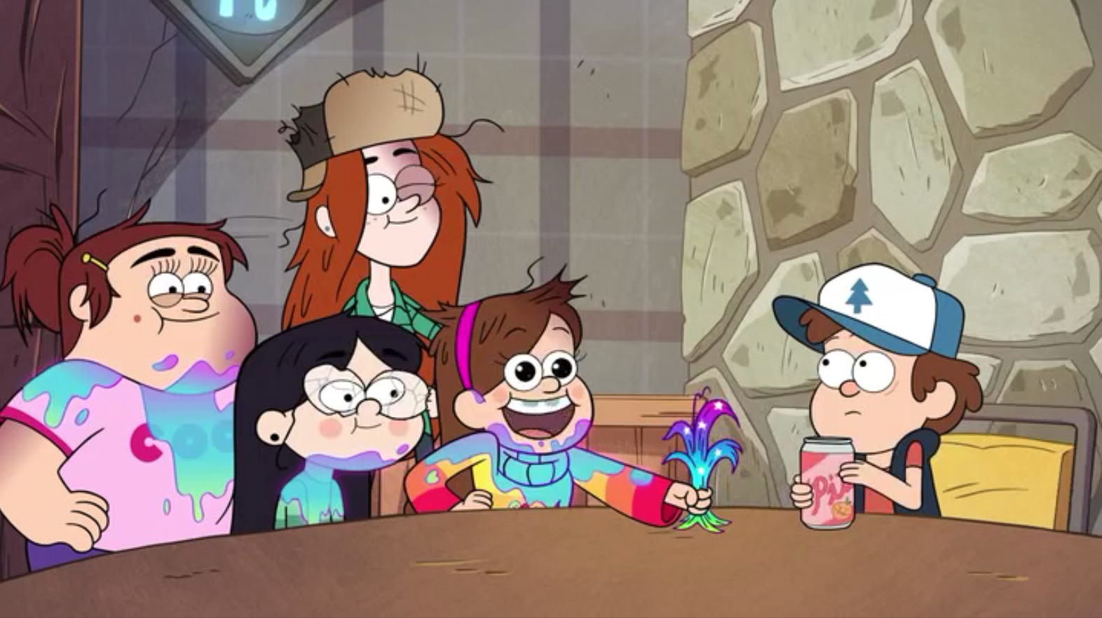 Ford hid the instructions from his journals so no one could finish what Bill started, then dismantled the portal when he came back. However, the dimensional rift could be the next best way for Bill to enter our dimension. If Bill got his hands on the rift, it would mean the end of Gravity Falls and their universe. Back on the main floor of the Shack, Ford tells Dipper that there will be no more secrets between them. They will both do anything to stop Bill. Dipper realizes they have no way to Bill-proof themselves, as he broke the machine. Suddenly, Mabel and the girls appear, covered in various unicorn fluids. Mabel managed to get some unicorn hair and a treasure chest full of unicorn goodies. Ford is ecstatic, telling Mabel she is a good person. Mabel tears up and thanks him, but says that she's also realized morality is relative. As if on cue, Stan runs into the room and steals the money from the treasure chest.