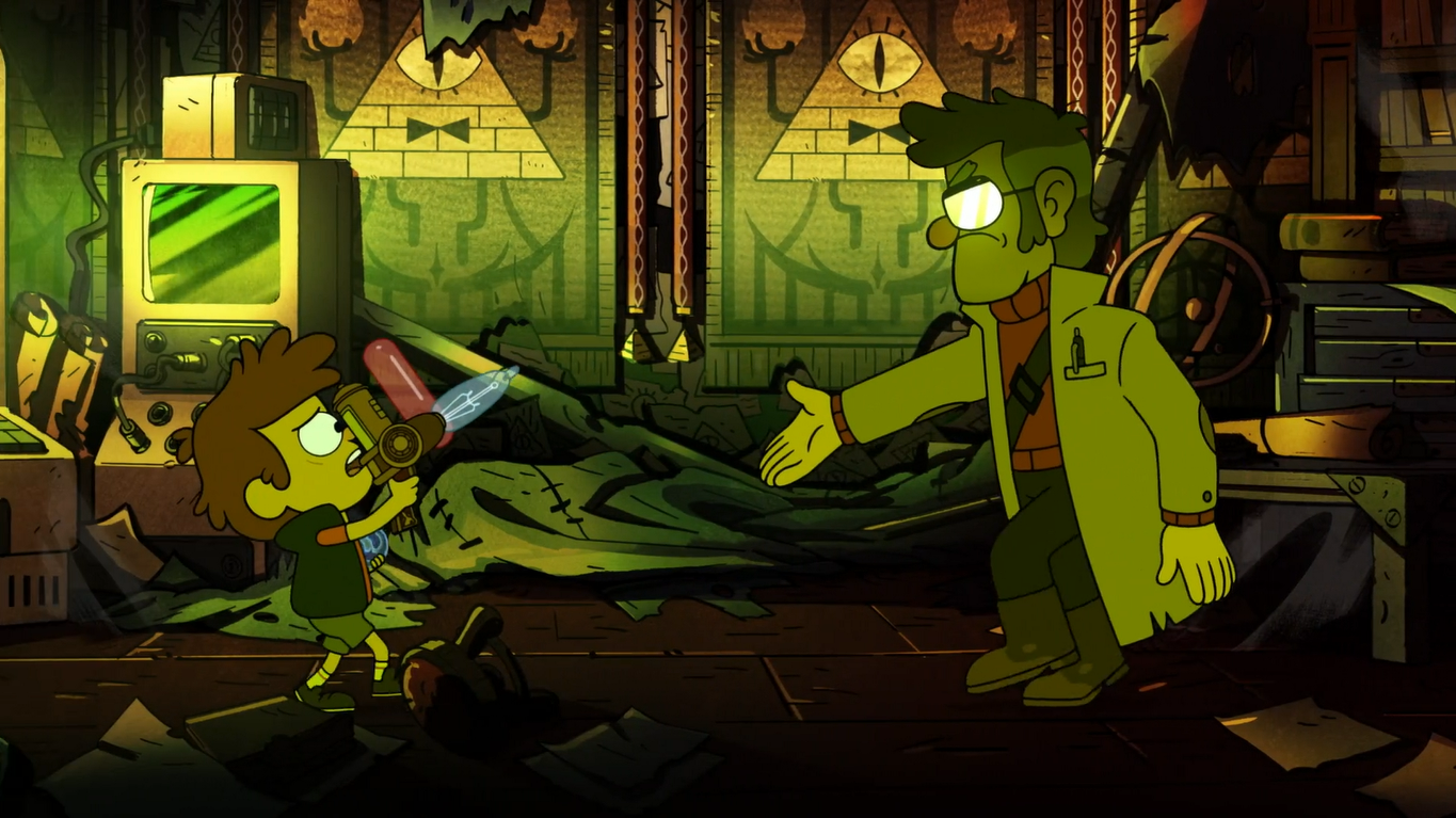 Ford takes the helmet off and throws it across the room, causing shades to fall off the walls. Posters and sculptures of Bill are revealed all over the walls, as if the room were a shrine to him. As a result, Dipper takes the rift and shields it from Ford, who begins walking towards Dipper, yelling at him to give him the rift. Dipper frantically asks Ford questions about his involvement with Bill, as he picks up the Memory Gun and points it at Ford, preparing to erase Bill out of Ford's mind. As Ford walks closer and closer, Dipper fires the gun. The shot hits Ford's glasses, bouncing across the room and hitting the terminals, destroying them. Ford picks up Dipper, telling him to calm down. His glasses stop shining, revealing he was not possessed by Bill after all. Dipper apologizes for almost wiping Ford's memory, which Ford accepts pointing out that due to the metal plate in his head it would not have worked anyway, but Dipper would have done great if he was actually possessed. He reveals his backstory with Bill to Dipper, saying Bill tricked him when he was younger. Long ago, he had hit a roadblock in his investigation of Gravity Falls. He found ancient writing in a cave, incantations to summon Bill along with warnings against doing so. When Ford read them aloud and went to sleep, Bill appeared in his mindscape. He lies to Ford, telling him that he chose to inspire one great mind every century, leading to Ford making a deal with him. Bill would help Ford with his research, but in exchange, Bill would have free access to Ford's mind. At first, it seemed Bill was helpful. Although McGucket was wary of him, the portal was completed with Bill's guidance, but when McGucket was accidentally transported through the portal during its test run, he discovered Bill's true intentions. Ford confronted Bill and the latter revealed his plot – the portal would act as a gateway to the Nightmare Realm so that Bill and his followers could show Earth "how to party." Panicked, Ford shut down the portal for good, even though Bill said that would not be enough.